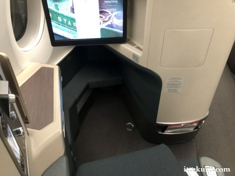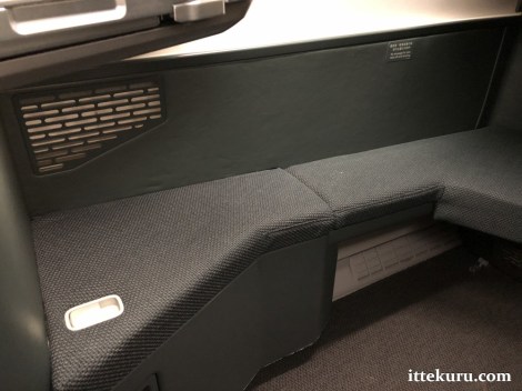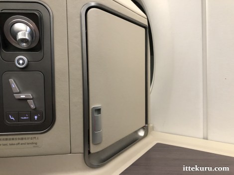 The hard-walled seat pocket is located near the floor, by the aisle. Whilst less convenient for storage purposes, the seat pocket isn’t really needed in this type of berth, given all the extra places (specifically the side and foot-well cabinets) where one might keep small articles.