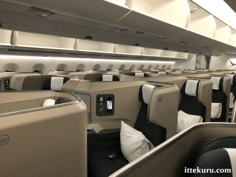 The spacious Business Class cabin in CX’s A350-1000 occupies the entire section between the forward and second doors. 11 rows in a 1-2-1 configuration (numbered as rows 12-23), plus 1 row of 2 middle seats at the front (numbered as row 11), for a total of 46 seats.