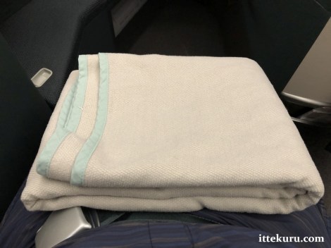 There was a pillow propped up on the seat ahead of boarding. The blanket was offered separately as part of the initial round of service.