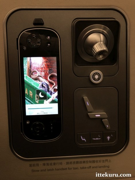 We’ll have more to say about the IFE screen and controller later on. The tethered controller is berthed in the same instrument panel as the reading light and seat recline switches.
