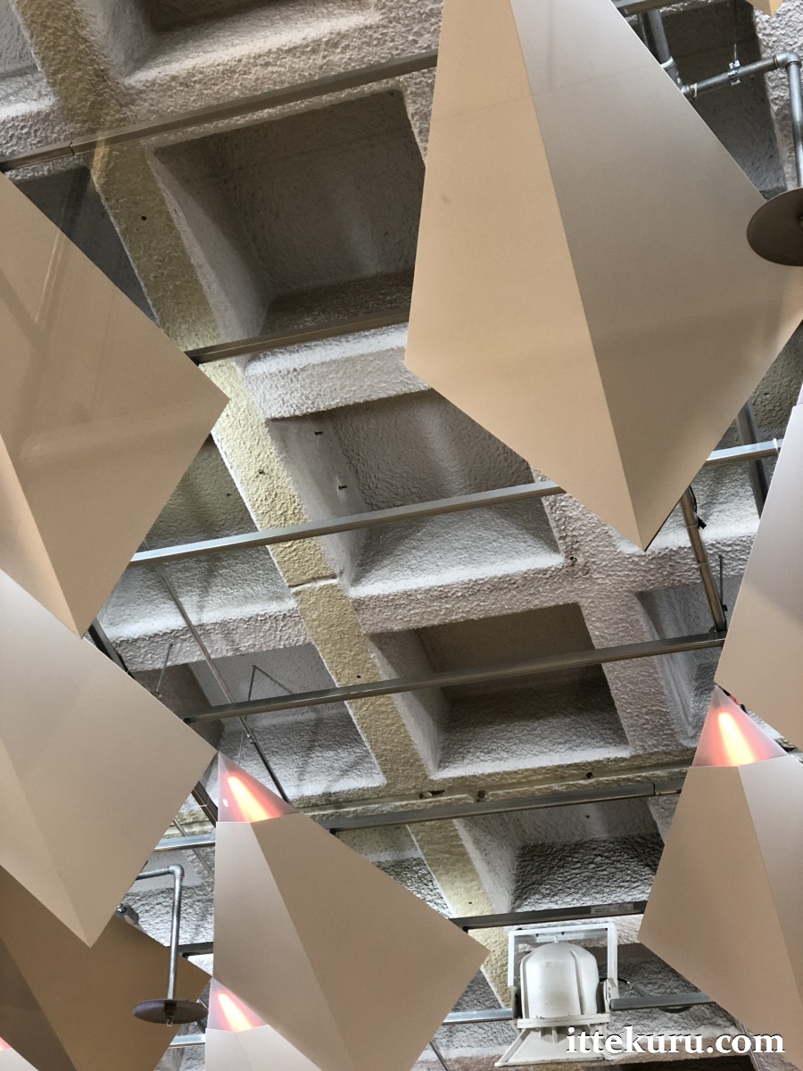 Look closely and you’ll see the old coffered ceiling just behind the decorative assembly of what almost looks like a fleet of paper aeroplanes. Nice way of integrating the old and the new.