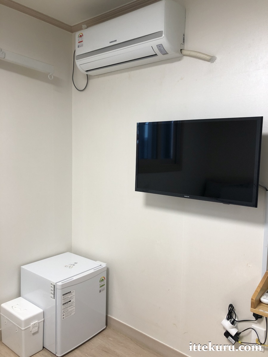 To the left of the mirror are some of the room’s modern conveniences: a flat-screen TV, an air-conditioning unit, and a small refrigerator. (We’ll get to the contents of that mysterious white box next to the fridge in a moment.)