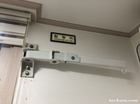 Apparently, if there’s a fire (or some other catastrophe) and a rapid evacuation is warranted, you’re supposed to hook the harness onto the bar and swing out of the window, then escape down the side of the building to safety. It’s standard-issue equipment for Korean hotel rooms – can’t say they’re everywhere but I’ve certainly seen this sort of thing in various establishments, from basic guesthouses to starred properties. Sometimes tucked away in a not-so-obvious corner, sometimes out in the open as here … but it’s probably there somewhere if you need it.