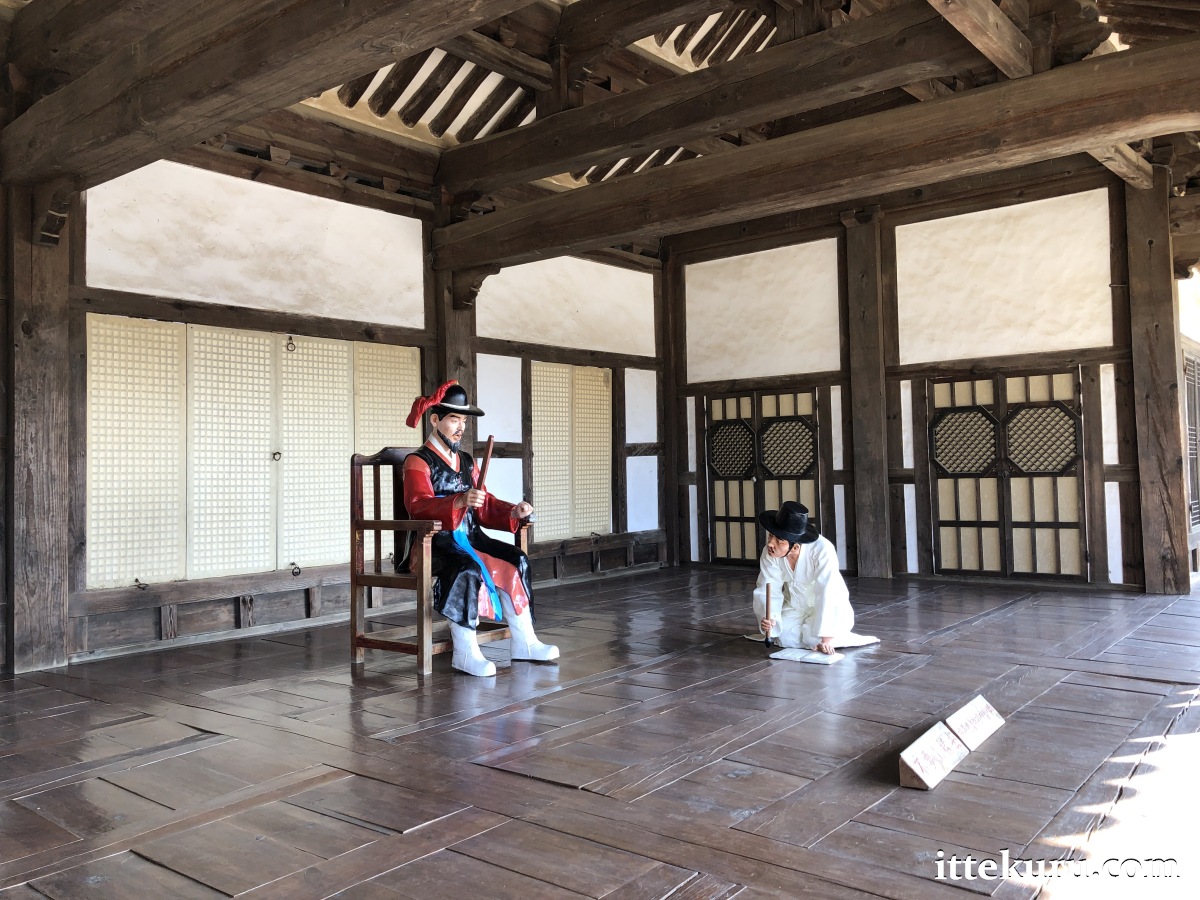 A good chunk of the village’s northwestern quarter is occupied by the Dongheon (동헌), the local government headquarters. Whilst the architecture is the key draw, one might also note the recreated Joseon-era trial (with a cast of mannequins) and the replica whipping board out in the front courtyard (which visitors might use to, er, vent out their frustrations on companions).