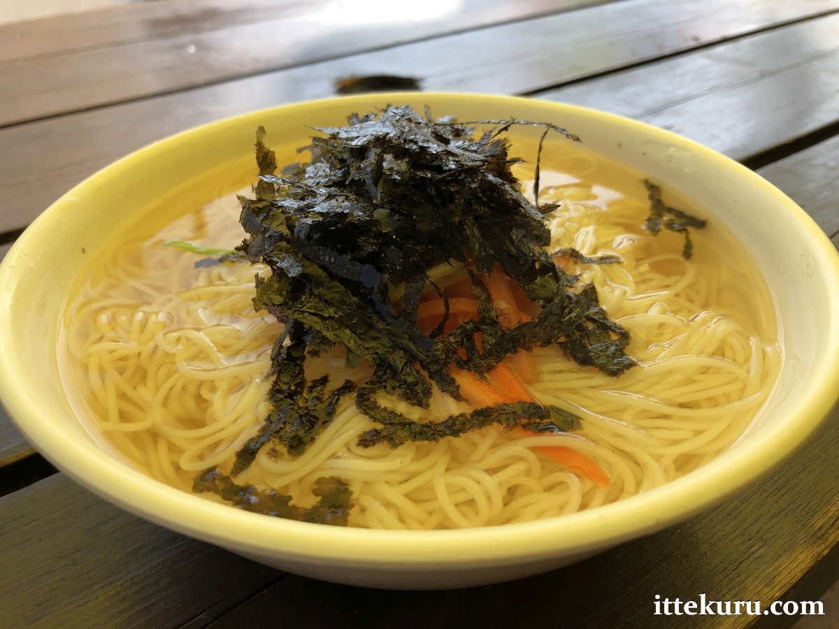 …followed by my choice of main course: a bowl of noodles topped with vegetables and shredded gim, served in a simple but well-flavoured and piping-hot broth. To add a little kick, I was also provided with a small dish of blended spicy seasoning.