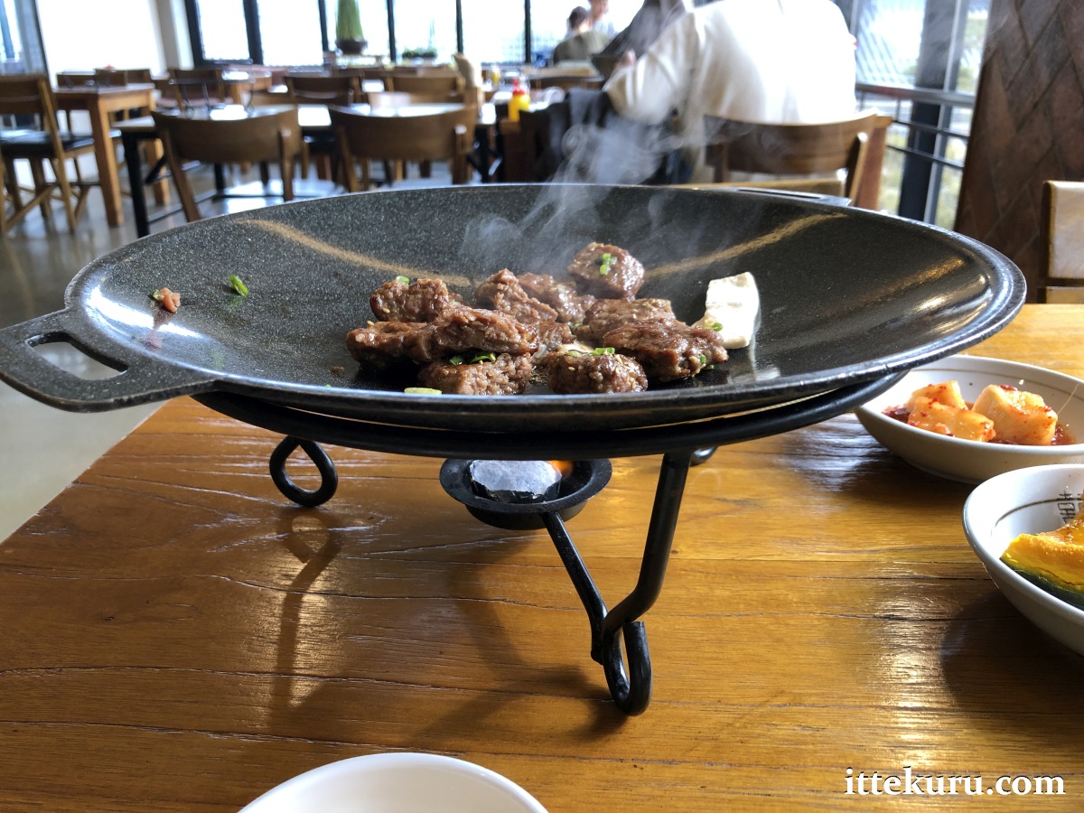 I was shortly presented with the main dish: Gyodong tteokgalbi roasted to sizzling on a dish right in front of me. These short-rib patties originally arrived as two or so larger pieces, but were quickly cut into smaller chunks by the server.