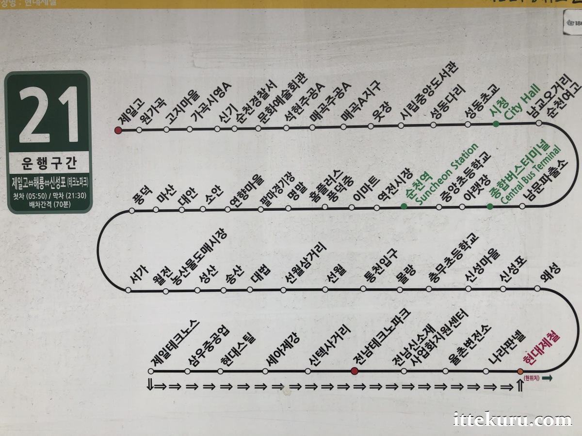 One particular bus – Number 21 – offered the most direct route to the castle from near Suncheon Station. The service operates so infrequently though that I practically wrote this off from the start.
