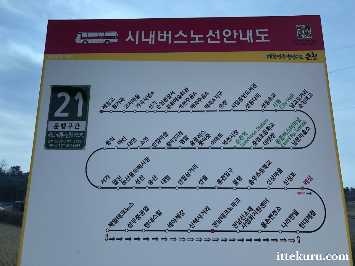 Bus Number 21 offers the most direct route from Suncheon Station, taking about 40-50 minutes (1,250 won with an IC card). The bus stops at 왜성 (“Waeseong”), which is just outside the castle’s parking lot.