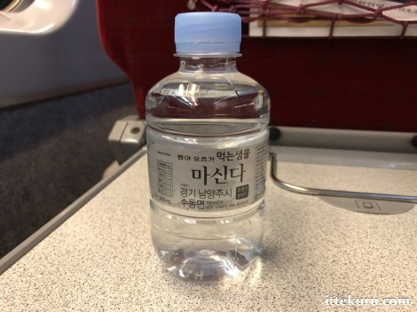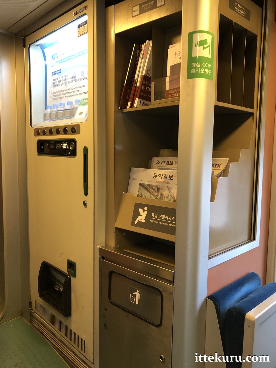 First Class passengers are offered complimentary snacks and bottled water. On the newer KTX-Sancheon trains, the water is served directly at your seat together with the snack package. But on older KTX-I trains like this one, you’ll need to fetch the water yourself from a vending machine next to the First Class compartment. (Note: it’s still free; the machine won’t require you to insert cash.)