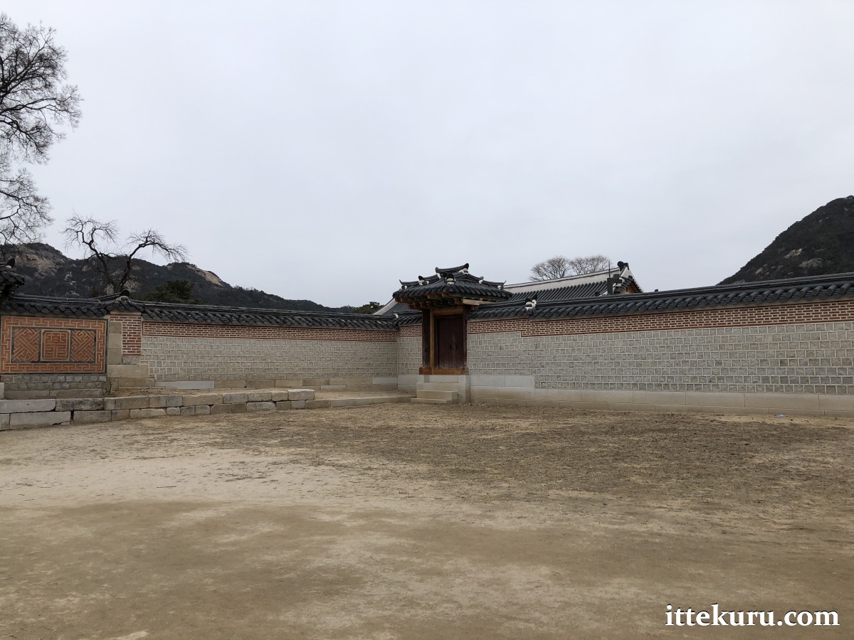 I began my approach from the southeast, walking northwards with the queen-consort’s residence on my left. In the following picture, you can see part of that compound’s wall – with its distinctive decorative brickwork – on the extreme left. The simpler, stone-cased wall that continues on from there is part of the Heungbokjeon enclosure.