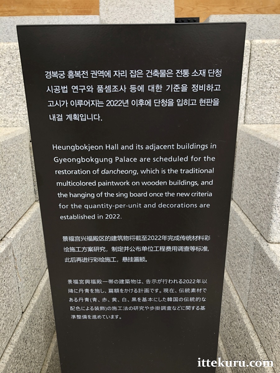 The same lavish decorative work will eventually be applied to Heungbokjeon, although this has had to be put off for the moment (as explained in the following sign).