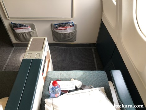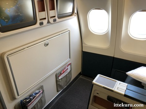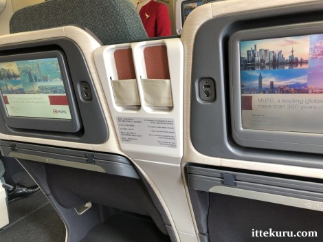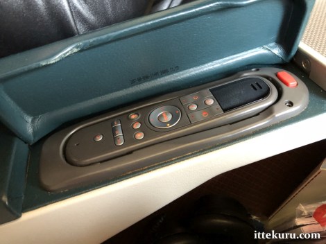 Less room, less comfort…and less storage space. No side-cabinets or floor-level lockers here; just a narrow pocket under the centre armrest and a niche for small articles (such as a phone or eyeglasses) next to the IFE screen. Note the seat control switches above the pocket and the headphone port within.