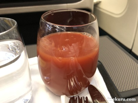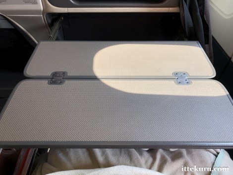 On my previous, longer flight – Seoul to Hong Kong on CX 417 – a cabin attendant set the table ahead of meal service by covering it with a starched linen cloth. Not this time, though: the tray with fruit starter, dessert, utensils, and my initial choice of drink (water) was brought out and placed directly on the bare surface.