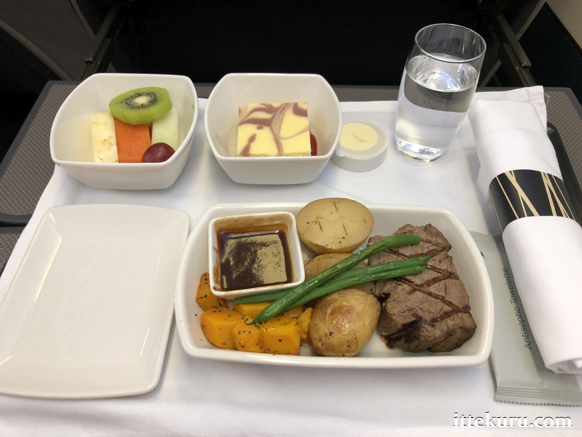 On my previous, longer flight – Seoul to Hong Kong on CX 417 – a cabin attendant set the table ahead of meal service by covering it with a starched linen cloth. Not this time, though: the tray with fruit starter, dessert, utensils, and my initial choice of drink (water) was brought out and placed directly on the bare surface.