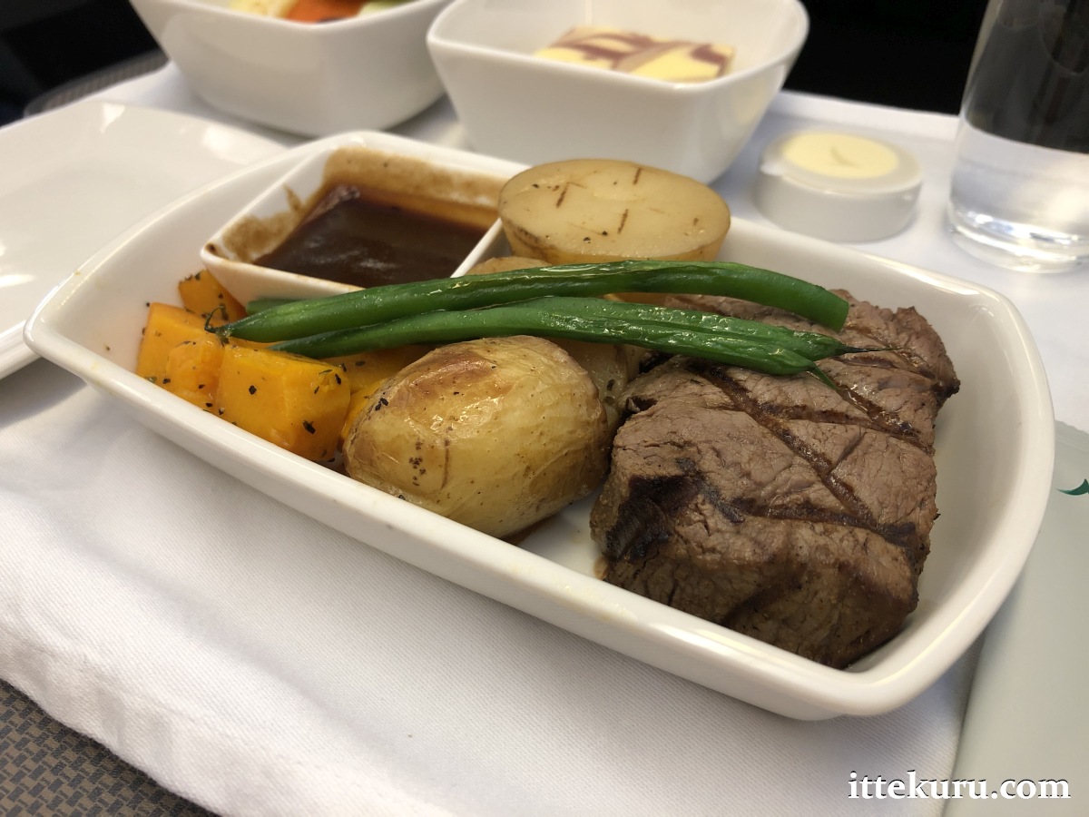 Let’s end this bit with a final observation regarding the in-flight meal. On the previous longer leg, CX 417 (ICN-HKG), the service format involved distinct courses, where each element was brought out in sequence and the previous course’s empty dish would be cleared away to make room for the one following. In contrast, on CX 919, all courses were served at about the same time and accumulated together on the tray, with brief gaps for bringing out the main course and offering a selection of bread to choose from.