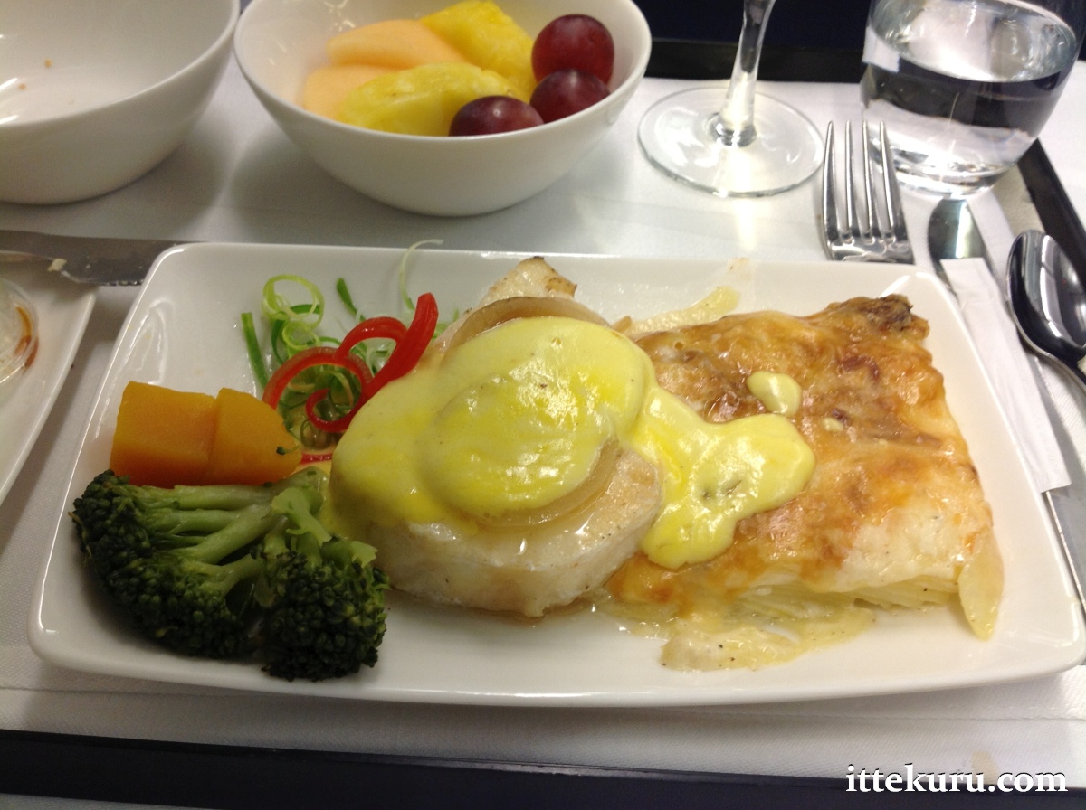 Whilst perusing the menu earlier in the flight, I saw that one of the mains featured fish as its centrepiece. Now I don’t normally eat seafood (as mentioned earlier), but I’m not averse to having a tiny bit of fish on occasion—as opposed to squid or crustaceans or anything similar where the merest whiff is enough to make me nauseous. I enquired of the cabin crew whether I could have the fish instead of the vegetarian main, and they were kind enough to accommodate the change.