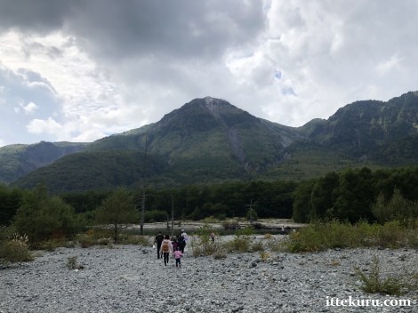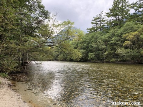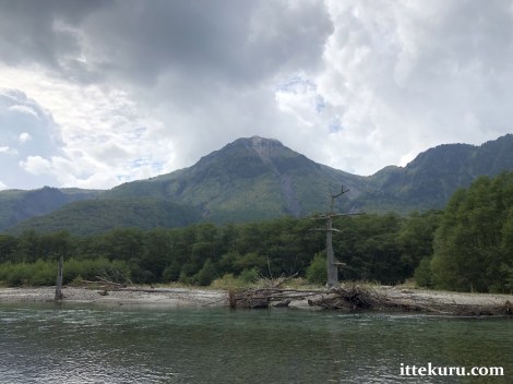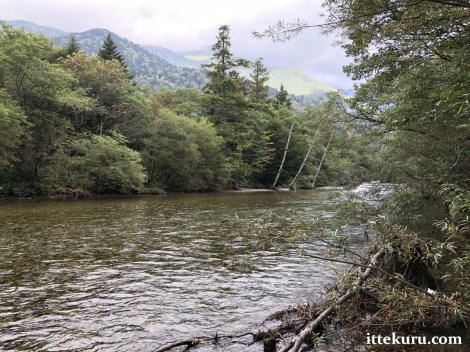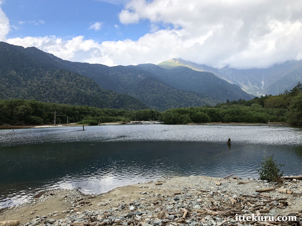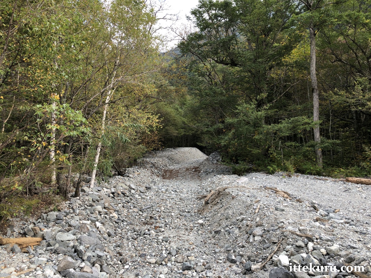 Eventually, I emerged into a rocky clearing near the northern tip of Taishō-ike. This fan-shaped gravel “beach” was formed out of erosion deposits carried down the slopes of Kasumizawa-dake (one of the mountains on the river’s east bank).