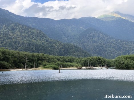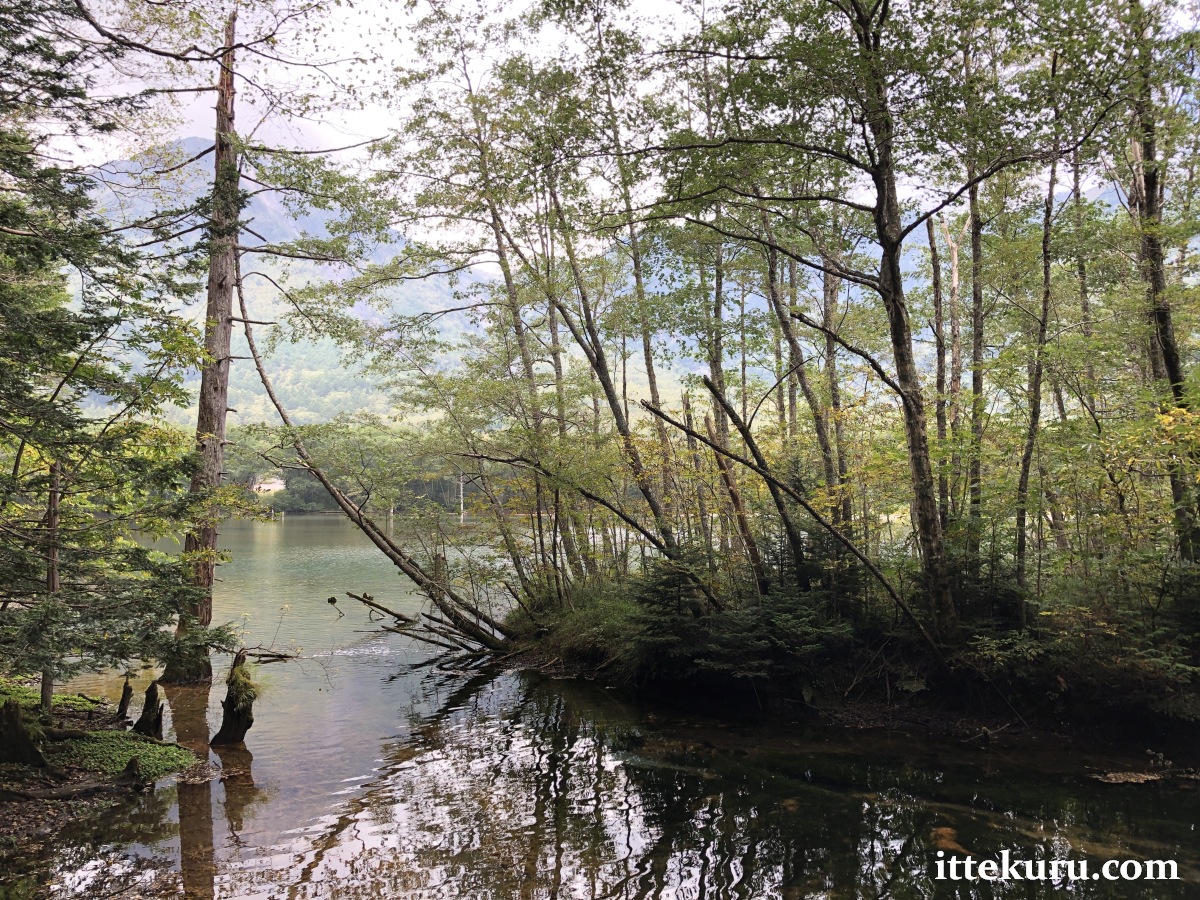 Pushing the notice aside in my mind (or at least trying to!), I walked a short distance from the bus stop to Taishō-ike (大正池 / Taishō Pond). This small natural reservoir is so named because it was formed in Taishō Year 4 (=A.D. 1915), when eruption deposits from the nearby Yake-dake volcano partially blocked the Azusa River channel. Even today, a few withered tree trunks can be seen poking out of the surface: remnants of the riverside forest drowned by the trapped waters more than a century ago.