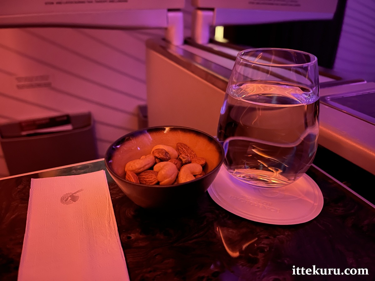 About 20 minutes after departure, the cabin crew went round to collect drinks orders. I kept things simple with still water, elegantly delivered in a glass with a bowl of assorted nuts.