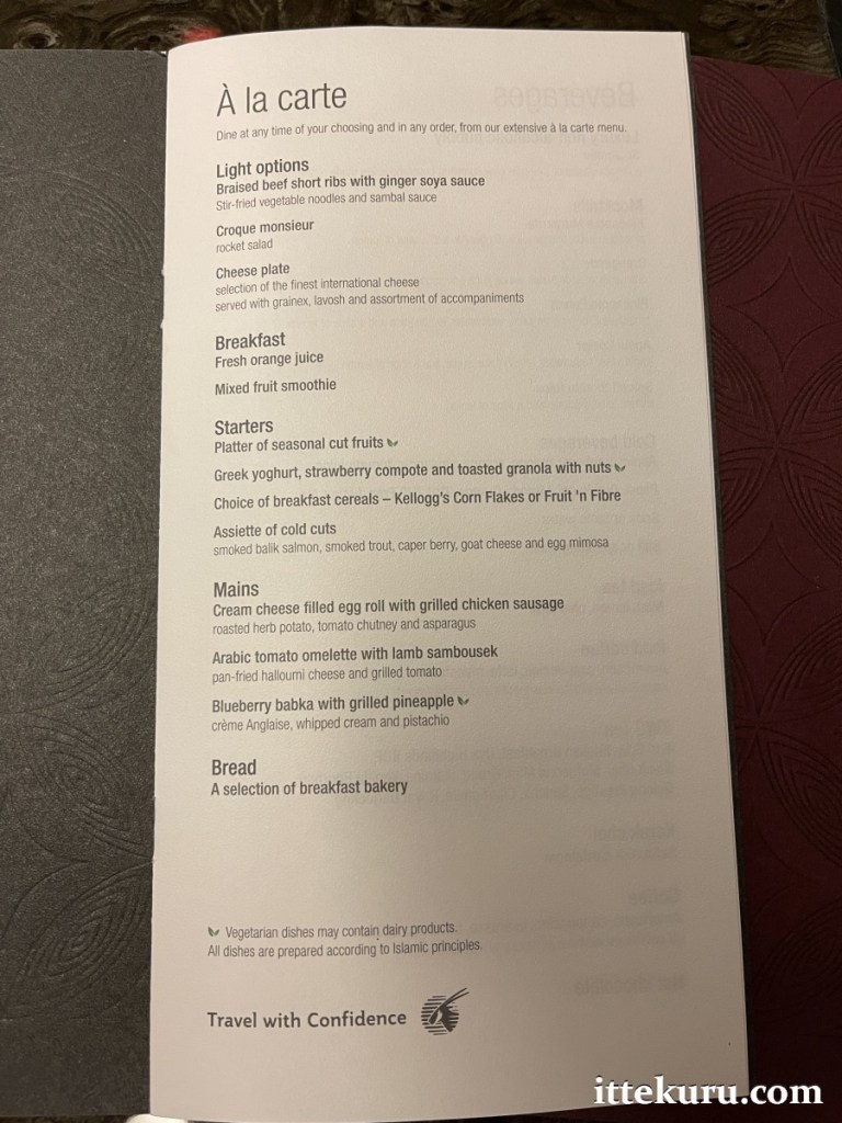 The food menu is a relatively simple affair at just four pages – two in English, two in Arabic (presumably containing the same information). I neglected to take a photograph of the second page, but if memory serves it’s just your standard list of non-alcoholic in-flight beverages (coffee, tea, etc.).