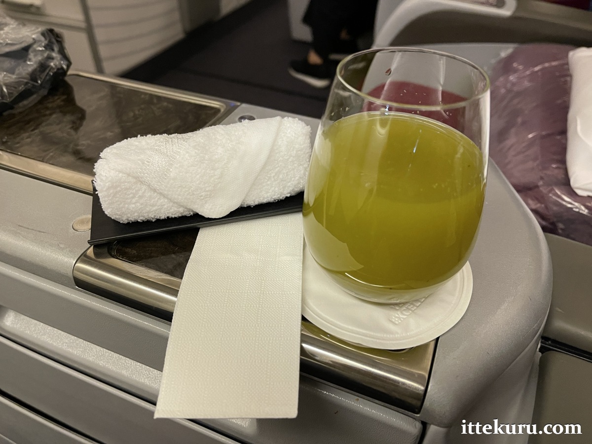 For my welcome drink, I chose QR’s signature beverage: a chilled non-alcoholic lemon mint cocktail. This arrived at my seat with a napkin and hot towel.