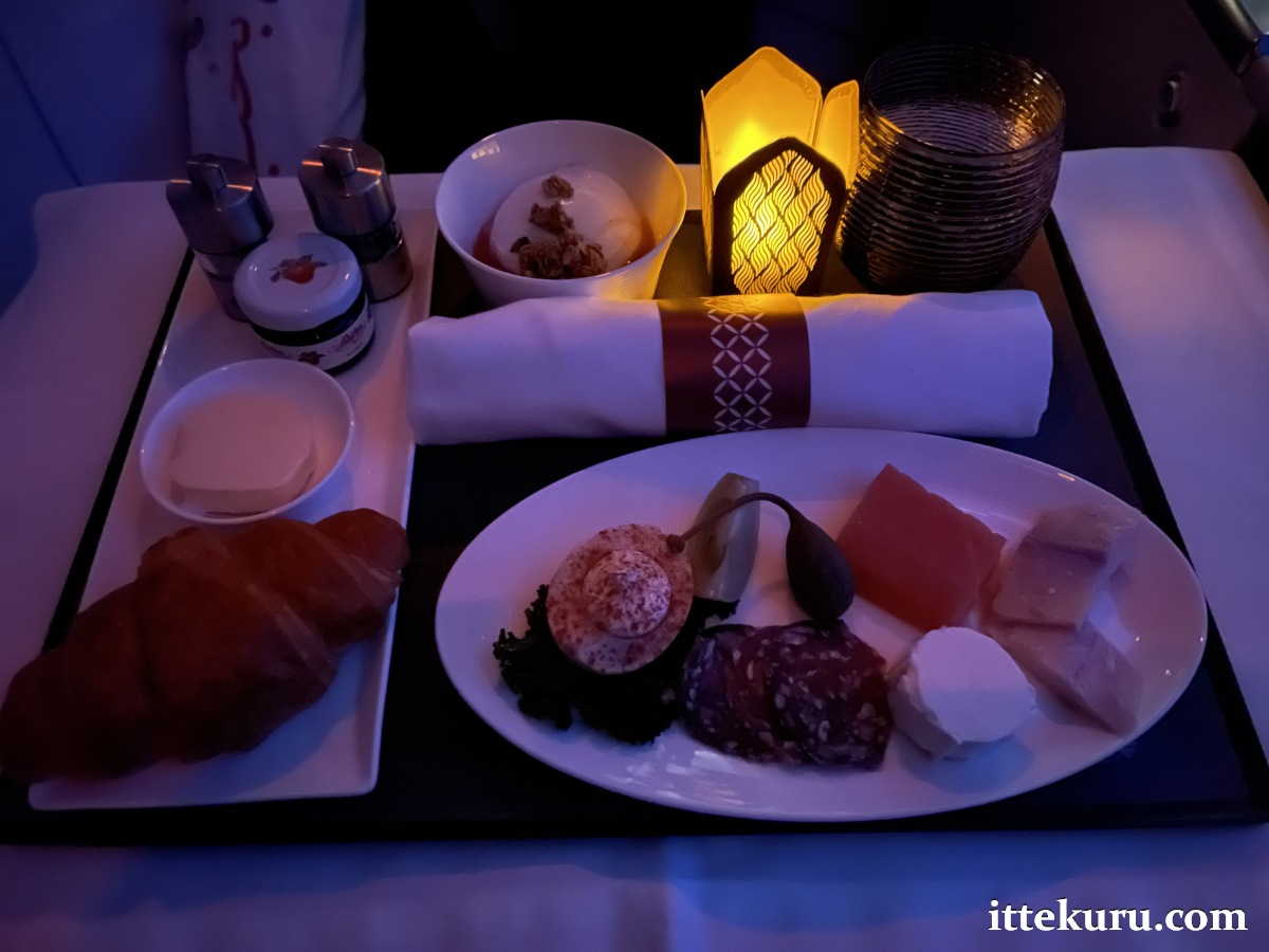 The initial table setting featured my pre-selected starter. An assiette of cold cuts including smoked balik salmon, smoked trout, caper berry, goat’s cheese, and egg mimosa. On the side: croissant with butter and jam; Greek yoghurt and strawberry compote topped with toasted granola.