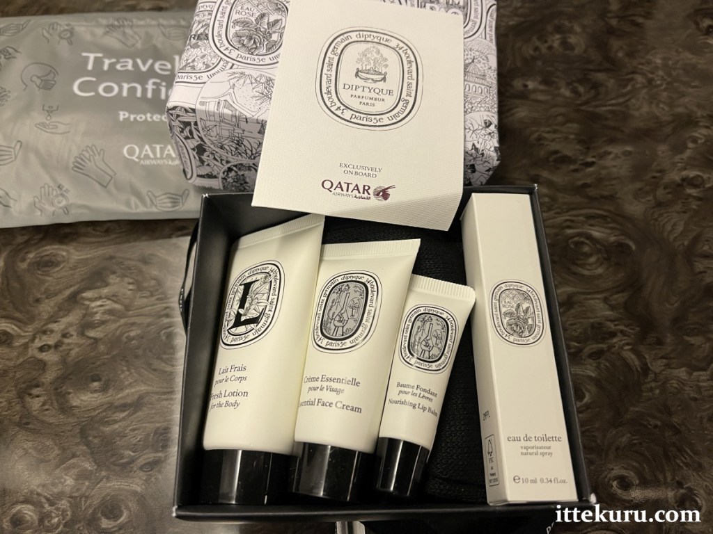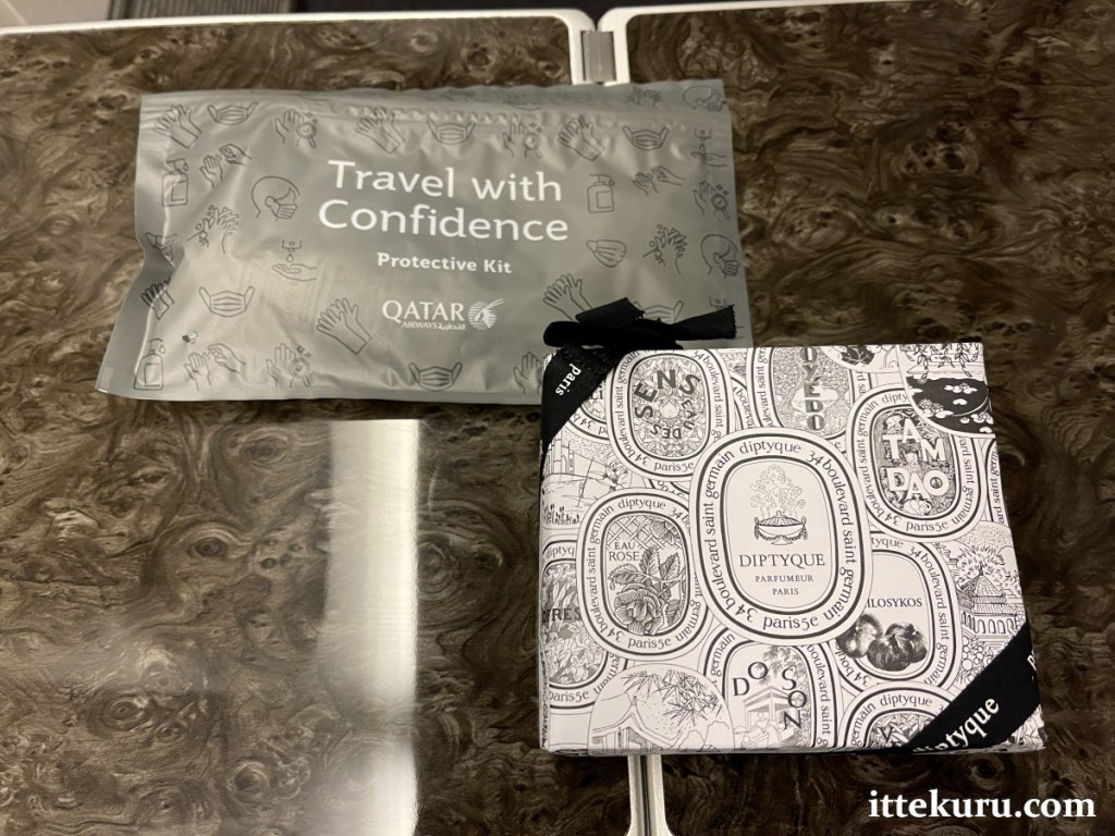 Perched on the armrest were two sets of amenities. The thin, grey plastic pouch is QR’s pandemic-era “Protective Kit” – standard issue for all travel classes – containing a mask, gloves, and sanitiser. The white box holds a premium set of toiletries exclusive to Business Class: body lotion, face cream, lip balm, and eau de toilette from the Parisian perfumer Diptyque (along with the usual socks, sleep mask, and ear plugs).