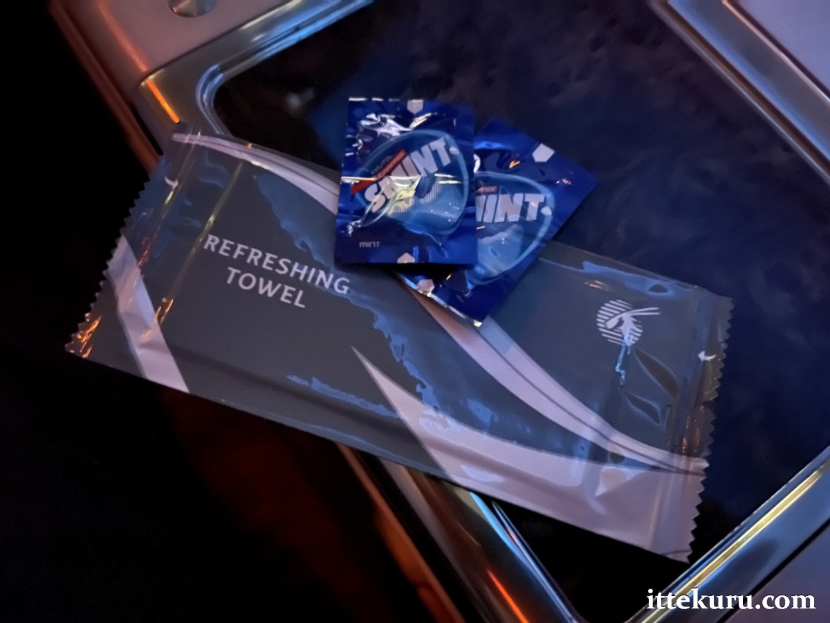 About an hour before landing (some time after breakfast), I was brought a couple of mints and a moist towelette.