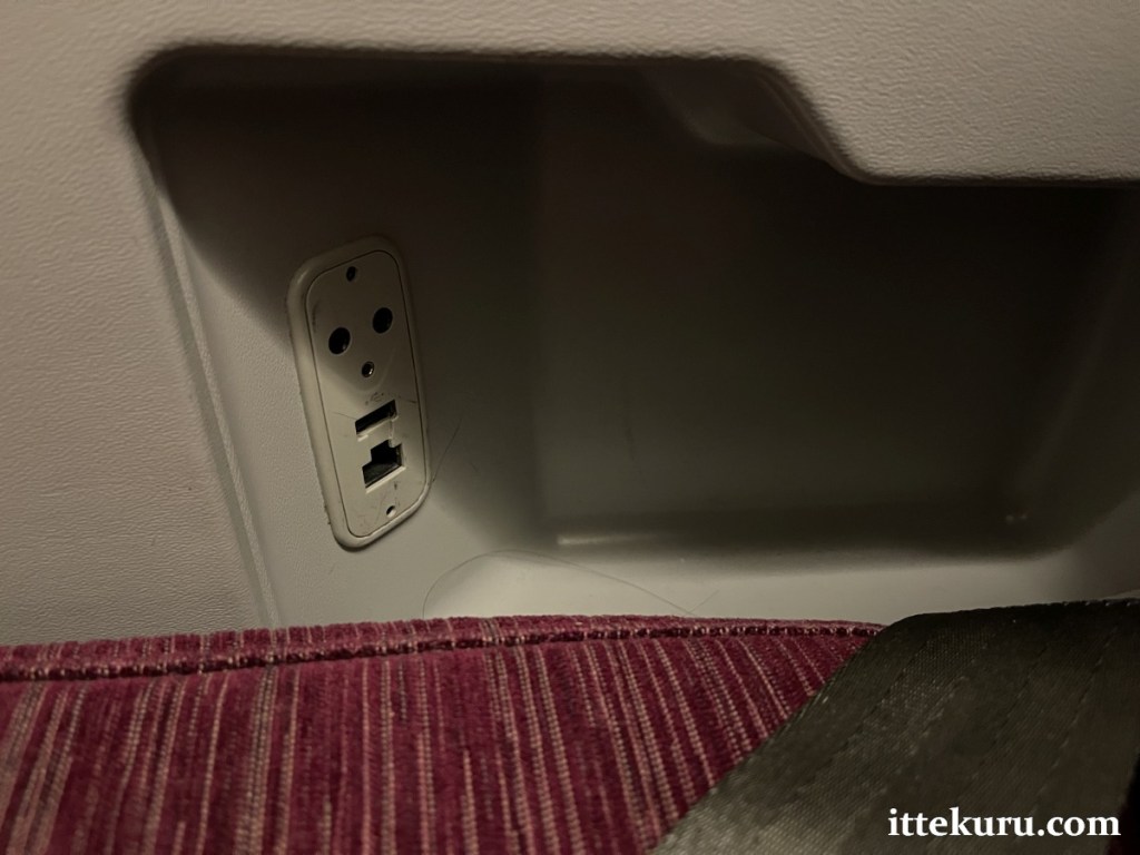 A bit lower down and back (next to the seat cushion), there’s a recess for keeping small items like mobile phones or eyeglasses. The outlet with two round openings is meant for the supplied headphones. Unfortunately, the only USB port available was for older Type A connectors, which meant that I couldn’t use my charging cables. (A Type C-compatible outlet or even a conventional power point for larger plugs would have been better given what I had.)