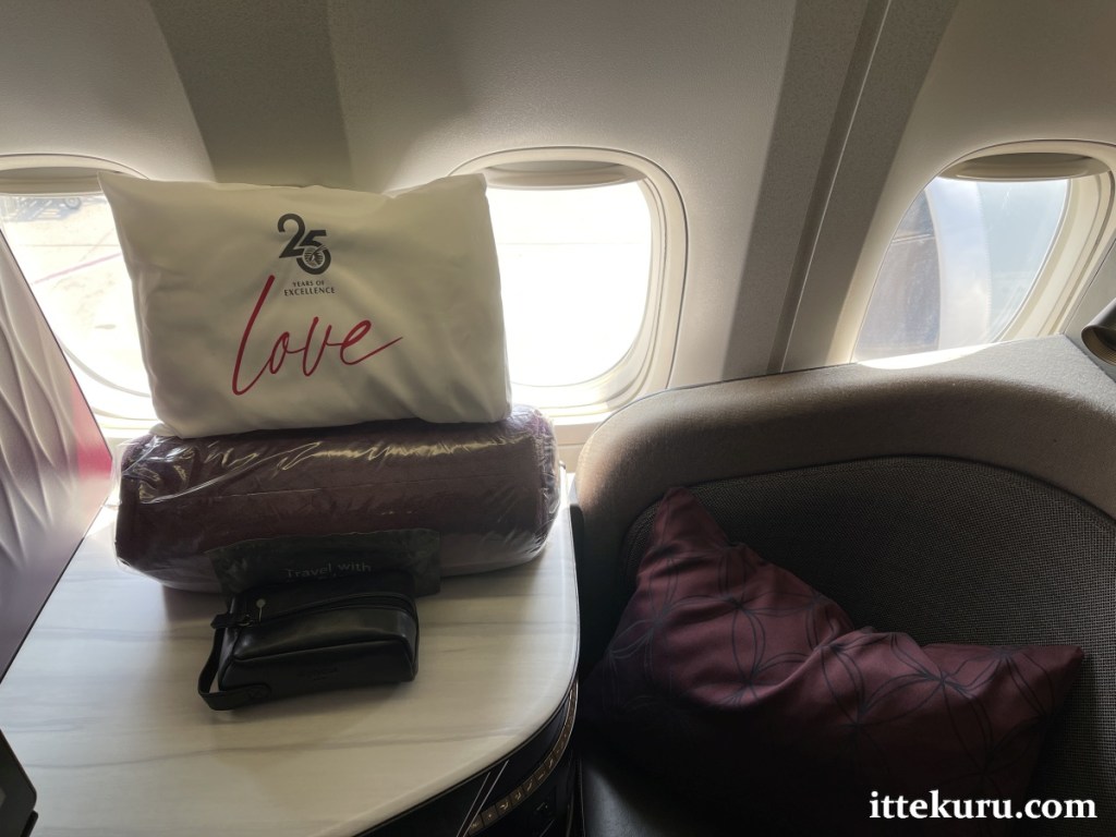 Next to the amenity bag was a thin, grey plastic pouch. This was QR’s pandemic-era “Protective Kit” – standard-issue for all travel classes – containing a mask, gloves, and sanitiser.