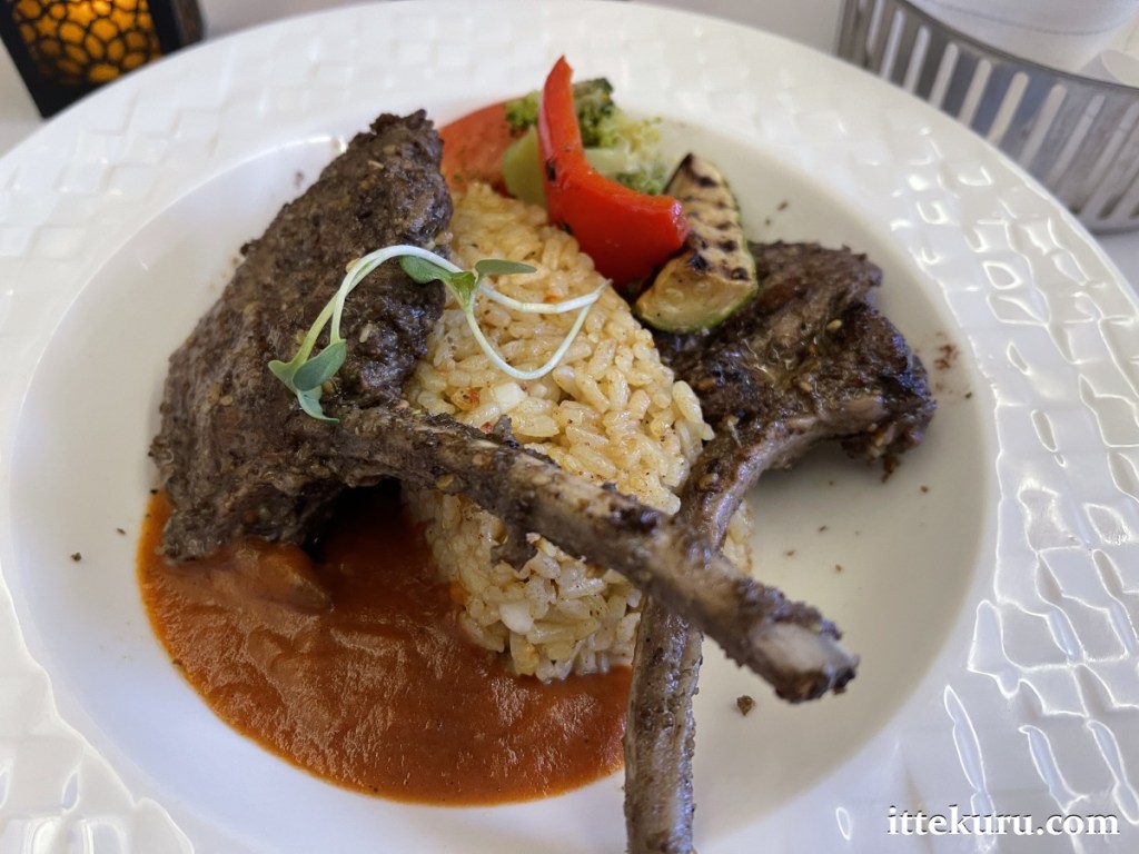 Time for the main dish. Za’atar lamb chops in red pepper sauce, served with halloumi Arabic rice and grilled vegetables.