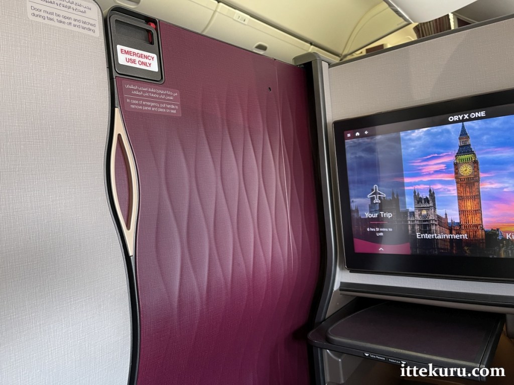 Every Qsuite was fitted with a sliding door – a simple but marvellous device that enabled each occupant to transform their seat into a completely private refuge. Well, almost completely private: you could of course peer over the wall whilst standing up and there was a gap near the floor by the footwell.