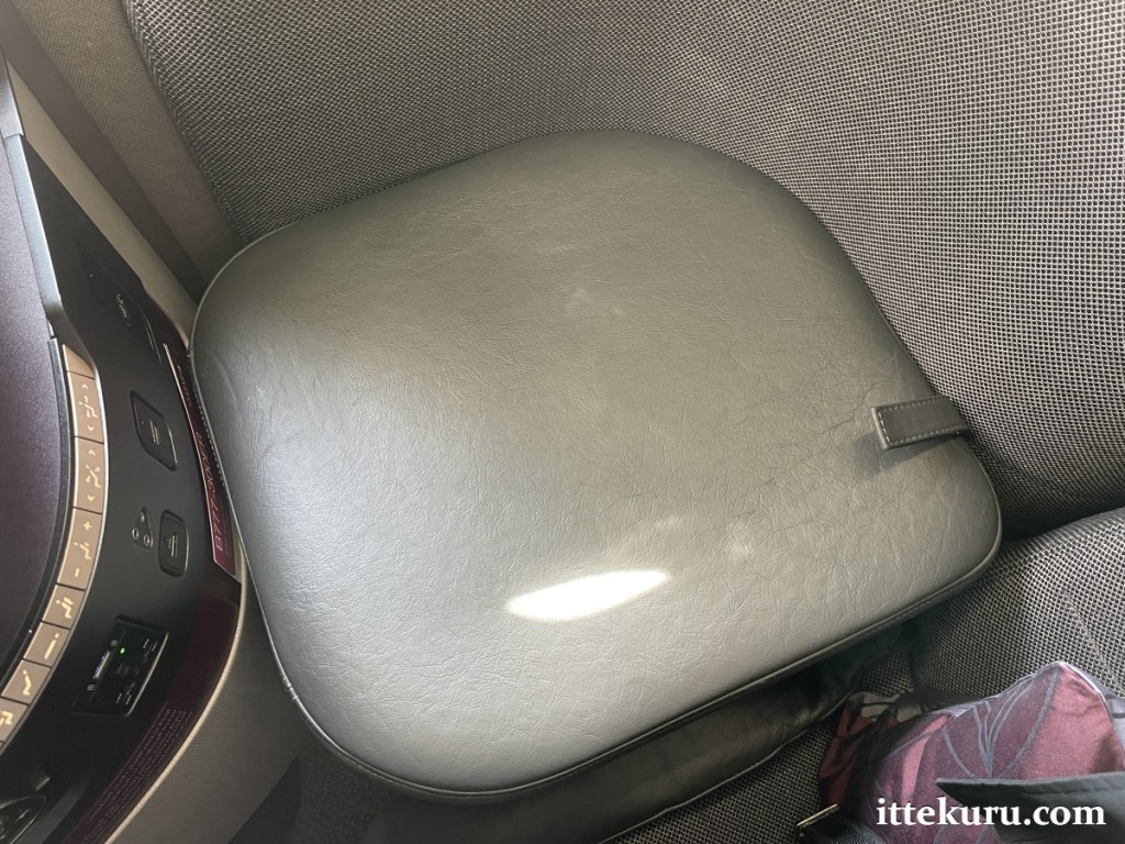 I found additional storage space for personal items underneath the ottoman’s padded lid. The hidden compartment also held a pair of noise-cancelling headphones, a bottle of drinking water, and an air sickness bag.