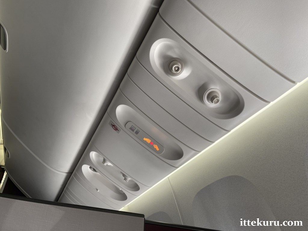 Nothing special about the overhead panel – just the usual air vents and warning lights. Interestingly, the traditional no-smoking sign’s been reduced to a non-illuminated sticker whilst new icons for electronic devices have been added in. (Changing times, changing priorities.)