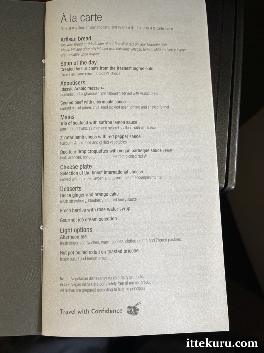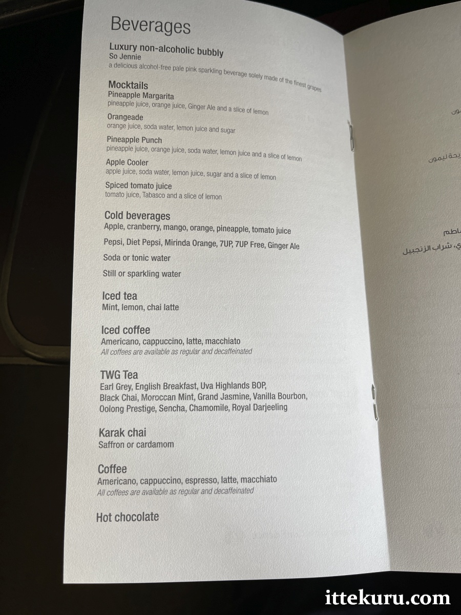 The food menu on QR 15 was a slim and simple affair. One page laying out the available meal options, followed by a second page listing a variety of non-alcoholic beverages.