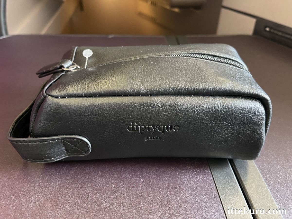 The side table was where I also found a faux leather pouch containing QR’s latest Business Class amenity kit (introduced in March 2022). This iteration includes body lotion, face cream, lip balm and eau de toilette from the Parisian perfumer Diptyque, packaged with the usual inflight care set of socks, sleep mask and ear plugs.