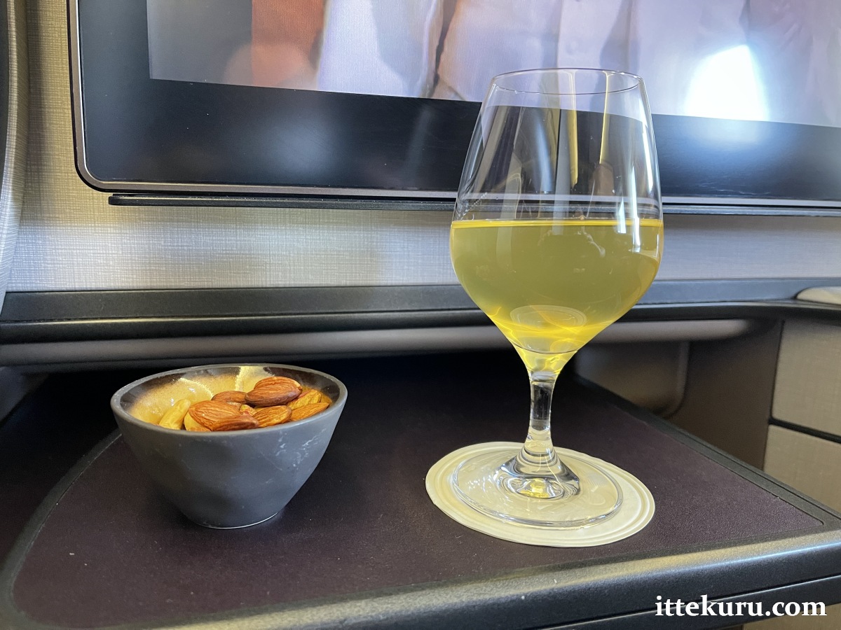 About half an hour after departure, the cabin crew rolled out the pre-meal drinks service. I cannot for the life of me remember what I ordered, but whatever’s in that wine glass was served to me with a bowl of mixed nuts.