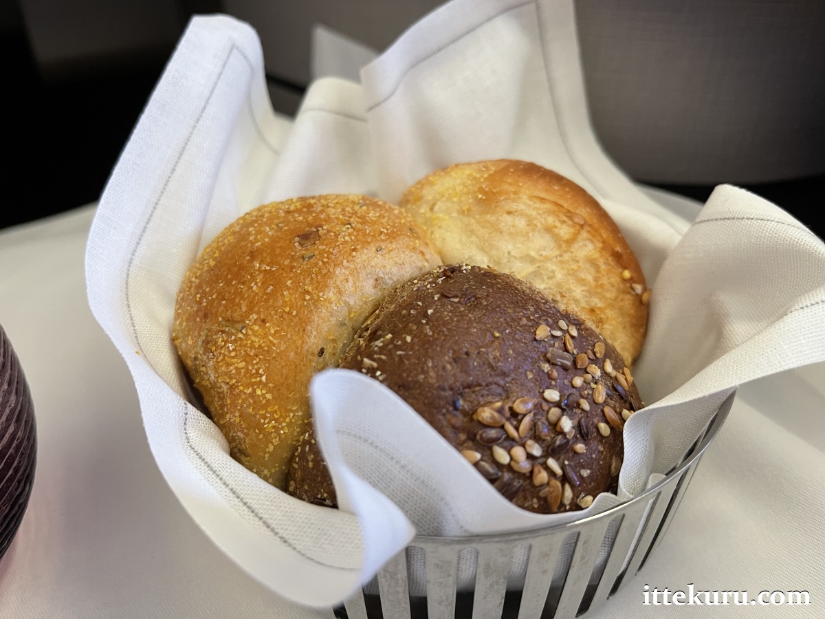 Whilst waiting for the main course, I tucked into the basket of artisan bread that was served with the initial place setting. Splash of olive oil, generous scrapes of butter…mm, very satisfying indeed. A world away from the plastic-wrapped rolls I’ve grown accustomed to in cattle class flights.