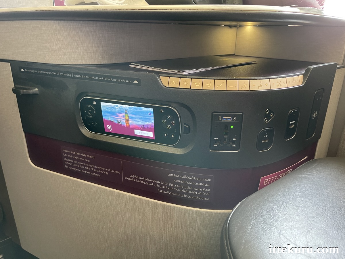 The instrument panel underneath the side table was fitted with a long row of buttons for adjusting the seat recline. Below these controls were an HDMI port, a USB port, and the familiar triangular socket for airline-supplied headphones. Next to these was a charging point designed to accept either a USB cable or a variety of conventional power plugs (rated 110V 60Hz). The console also held a touch-screen controller for the onboard entertainment system, tethered to its berth by a retractable cable.