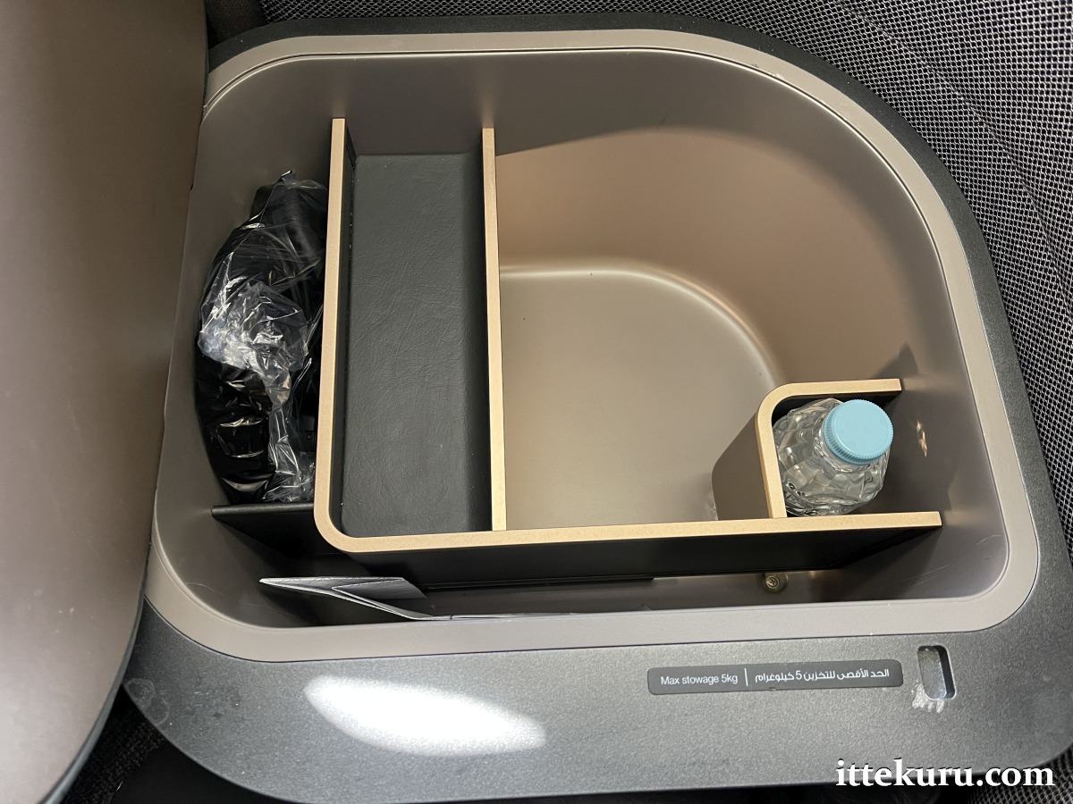 I found additional storage space for personal items underneath the ottoman’s padded lid. The hidden compartment also held a pair of noise-cancelling headphones, a bottle of drinking water, and an air sickness bag.