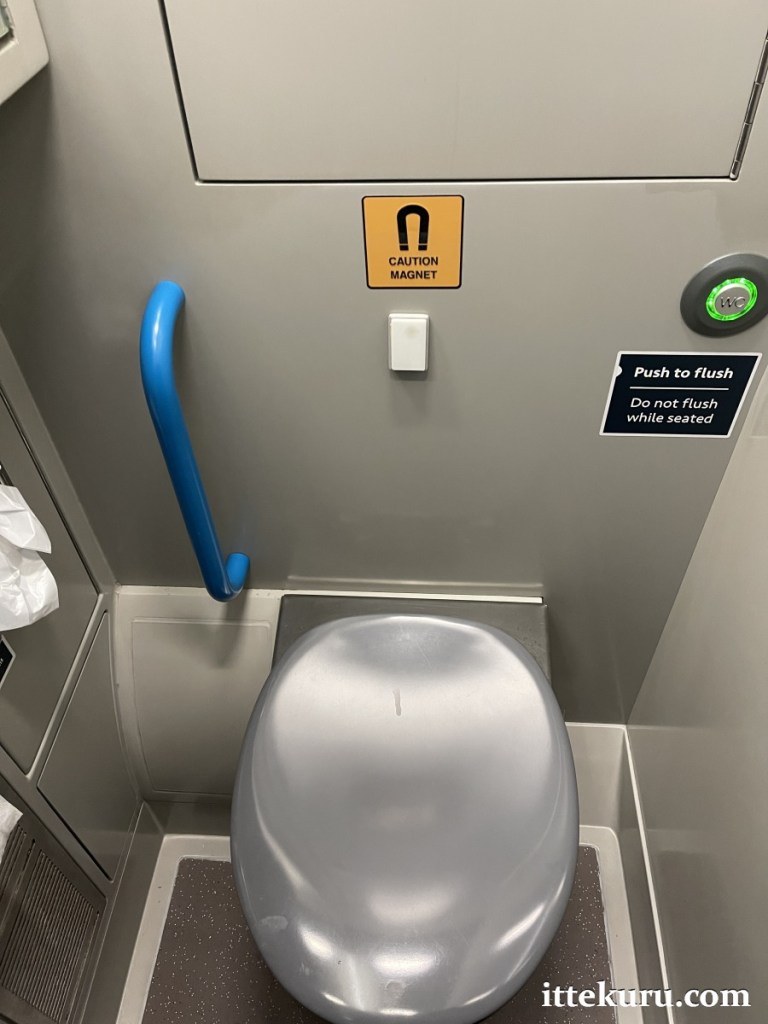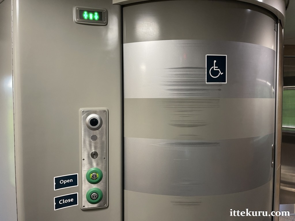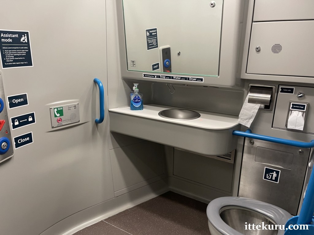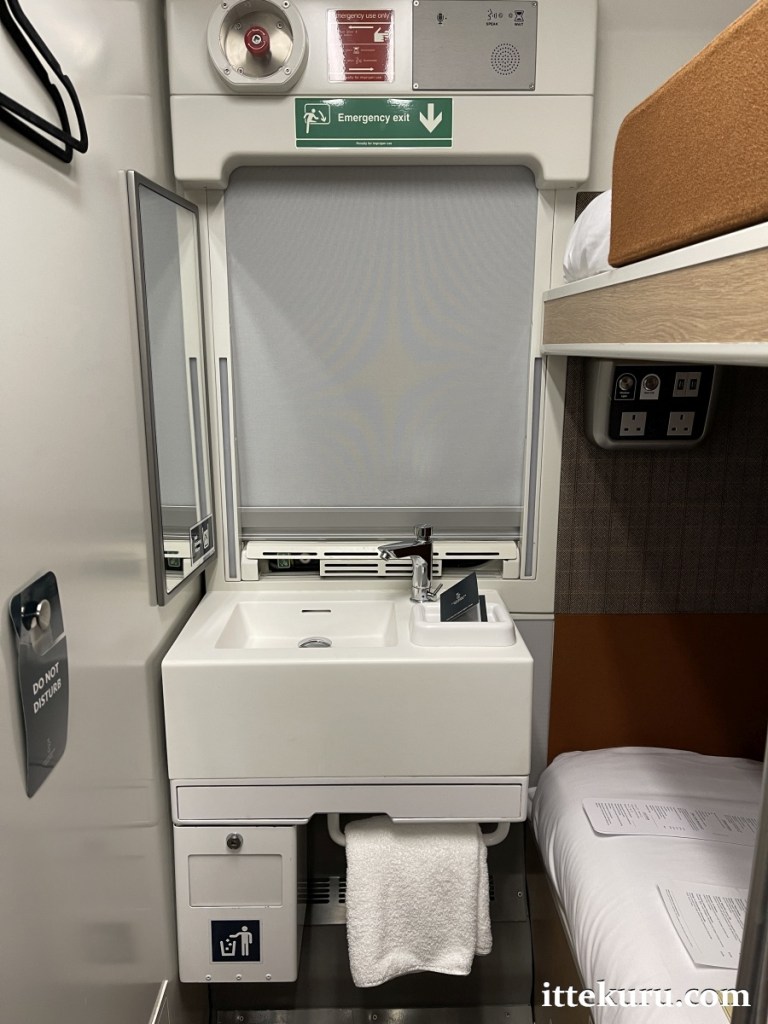 Coaches C through G (which have similar interior layouts) are each fitted with toilet booths similar to the one shown above. Coach B has two wheelchair-compatible toilets, one at either end of the car and each conveniently placed right next to an accessible bedroom.
