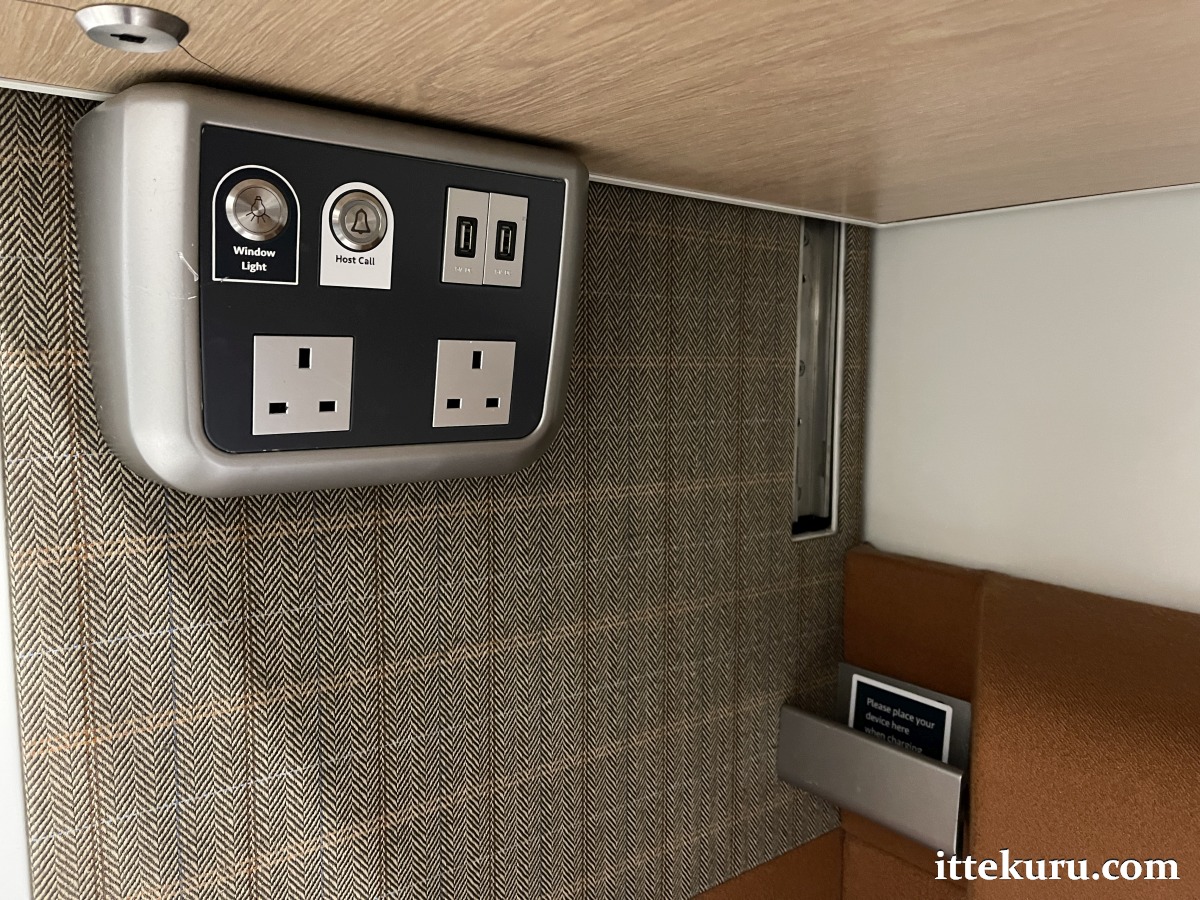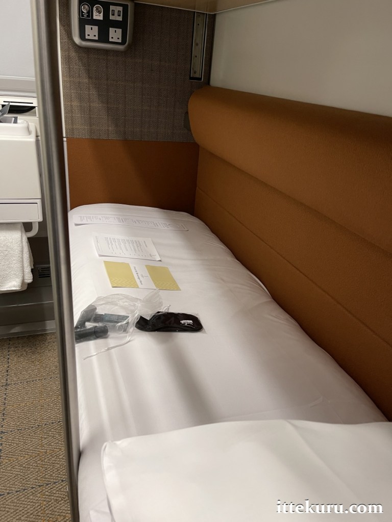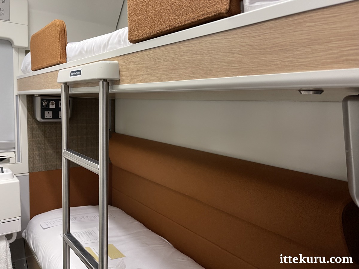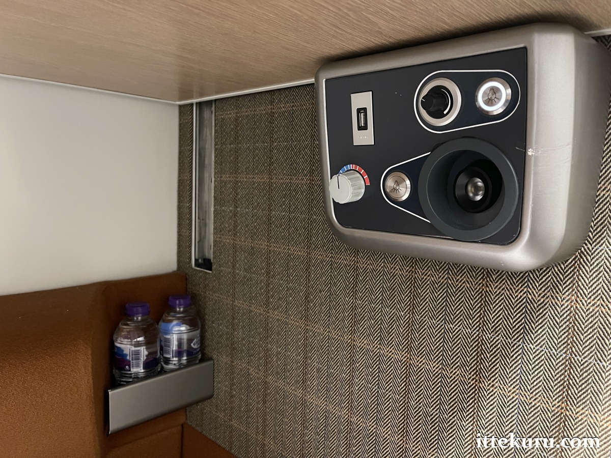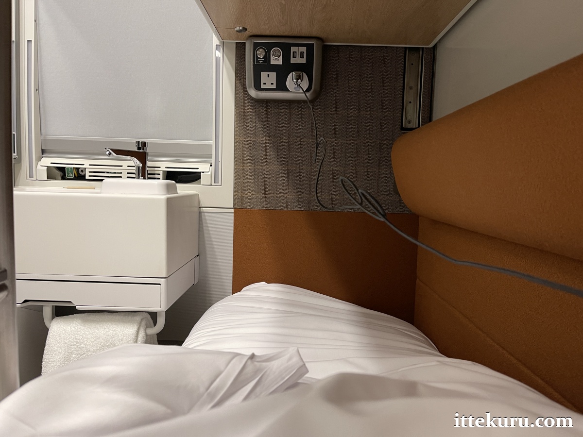 The lower bunk was equipped with two instrument panels. The one above my head featured a reading lamp, a USB charging port, and controls for the room light and air conditioning. The panel at the other end of the bed was fitted with two USB ports, two conventional power outlets, a switch for the window light and a host call button. (The upper bunk only had one instrument panel, with reading lamp and single USB port.)