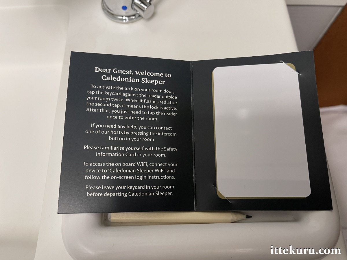 Next to the sink was a small folder containing my electronic room key. (As for the onboard Wi-Fi mentioned in the instructions, I couldn’t get it to work properly and went without for the duration.)