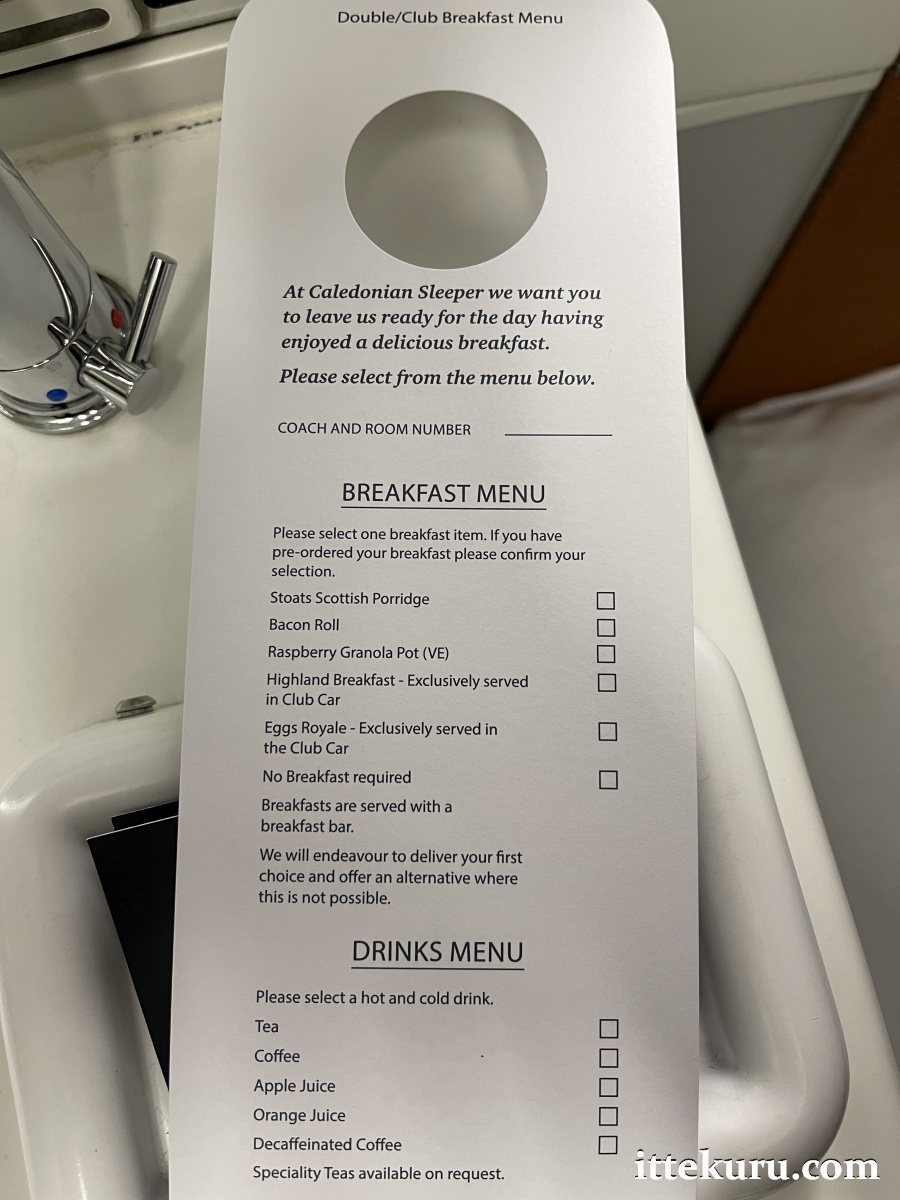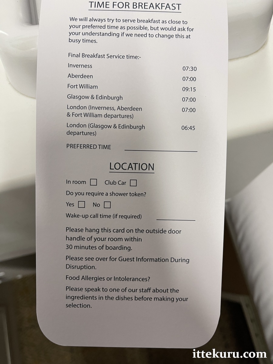 You’re meant to indicate your breakfast preferences and hang the card from your outside doorknob within 30 minutes of boarding. At some point thereafter, a member of staff will come round and collect the cards, and breakfasts will be prepared to match guests’ preferred meal choices and dining times (in theory at least).