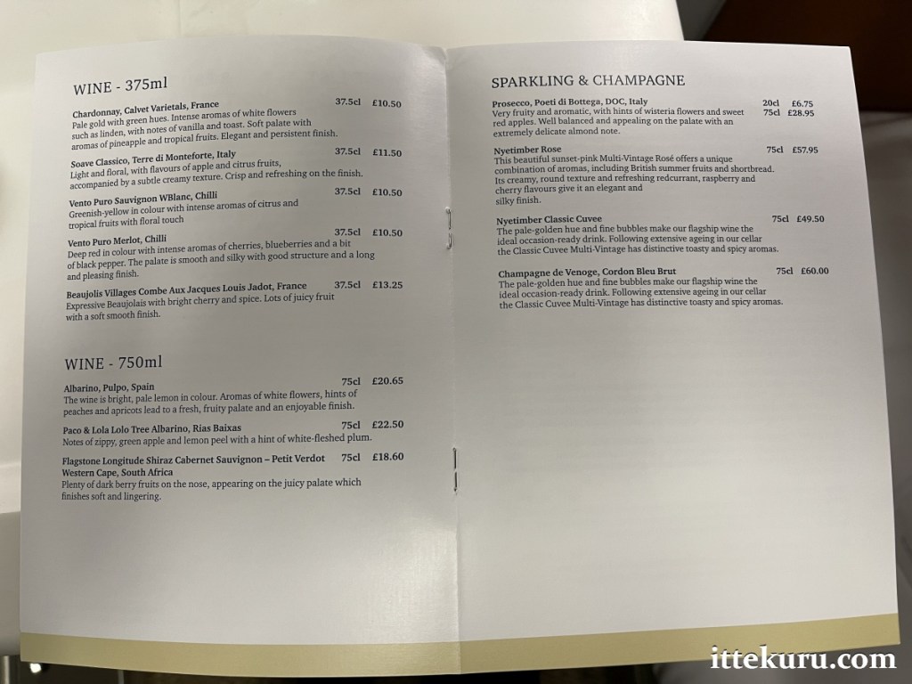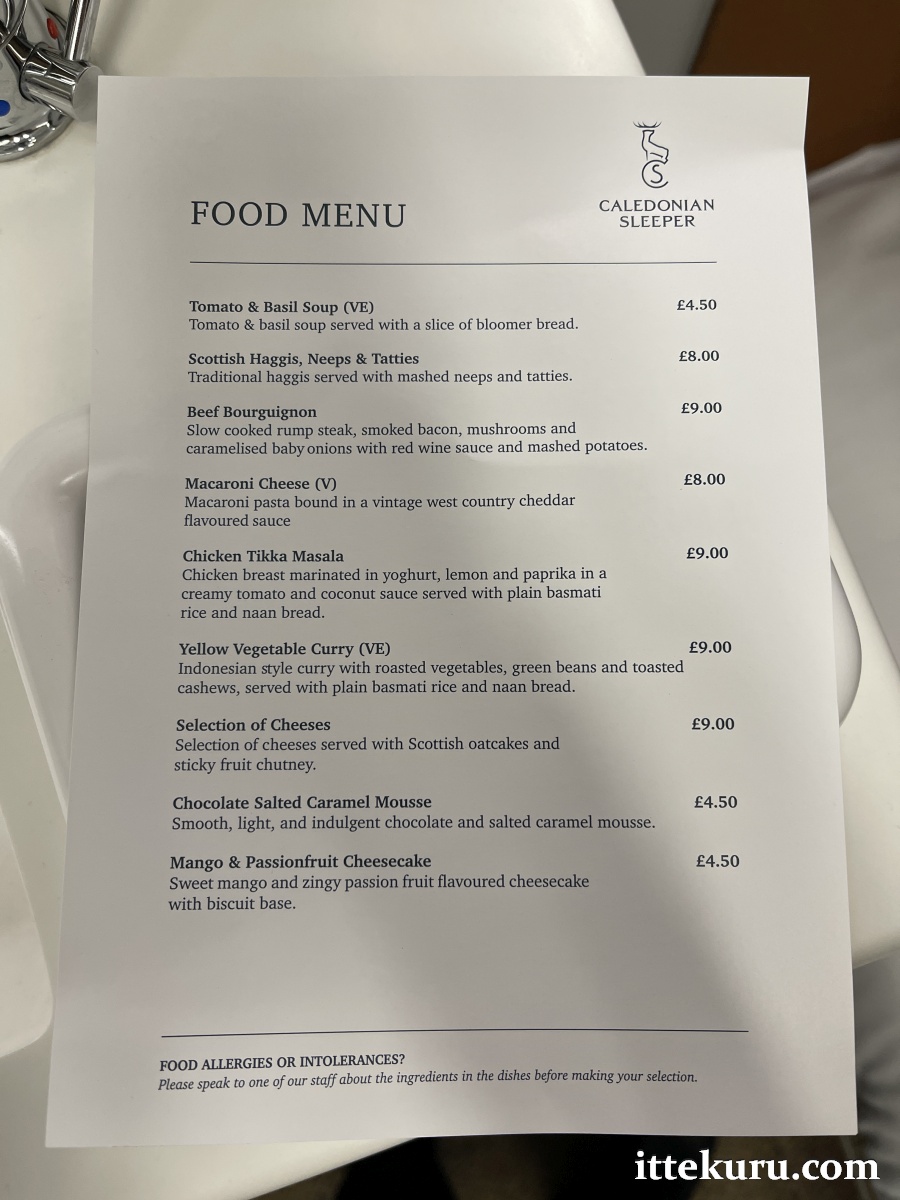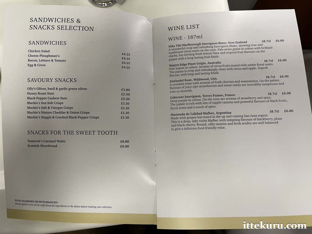 Next, there’s a buy-on-board menu card listing hot meals and desserts.