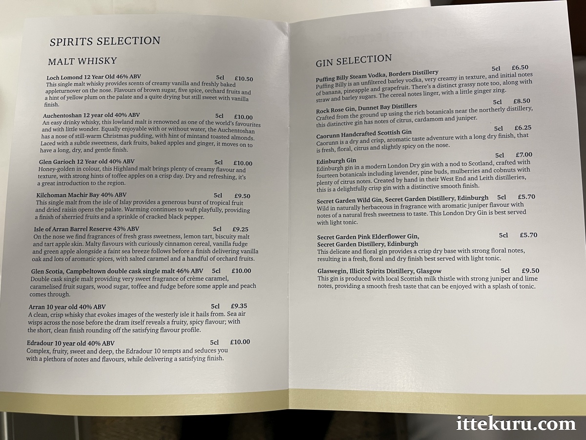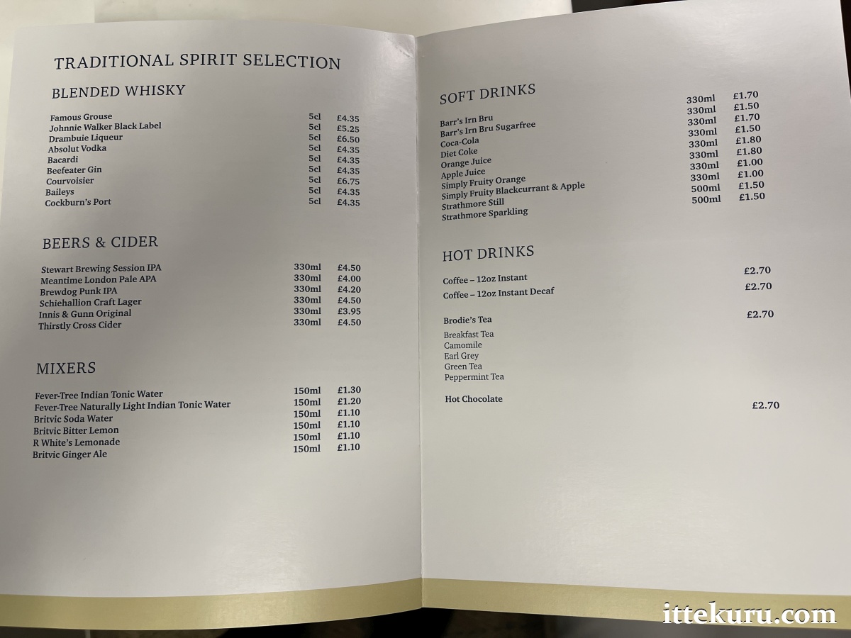 Finally, there’s a booklet with one page of snack items and seven pages of beverages. Needless to say, Scottish spirits (including whisky) feature quite prominently in this catalogue.
