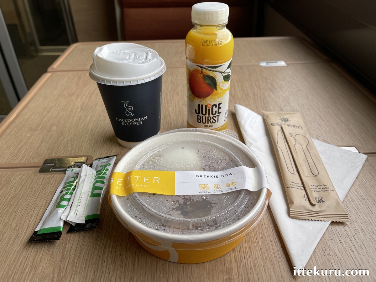 I’d pre-ordered a “Highland Breakfast” the evening before (using the supplied menu card), and based on older pictures/videos I’d seen ahead of the trip I was anticipating a substantial meal of sausages, black pudding, egg, toast, and so on, all served on proper china with real utensils.