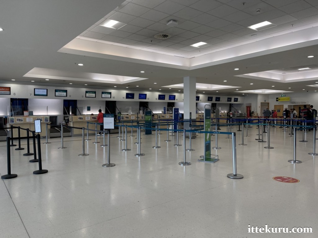 With the terminal’s main entrance behind you, turn left and walk all the way to the end of the main hall in order to reach the airline counters.