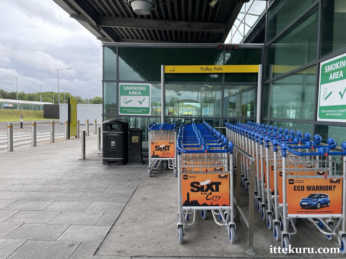 Right next to the glass-walled entrance is a smoking area and a trolley park. Heading off in the opposite direction is a covered walkway that leads to the bus stop and parking facilities.