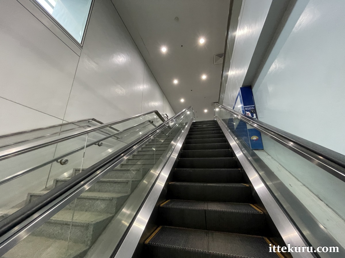 Whether arriving on foot or by bus, you’ll enter the terminal through a ground-level door and ride an escalator (or take the stairs) up to the arrivals concourse.